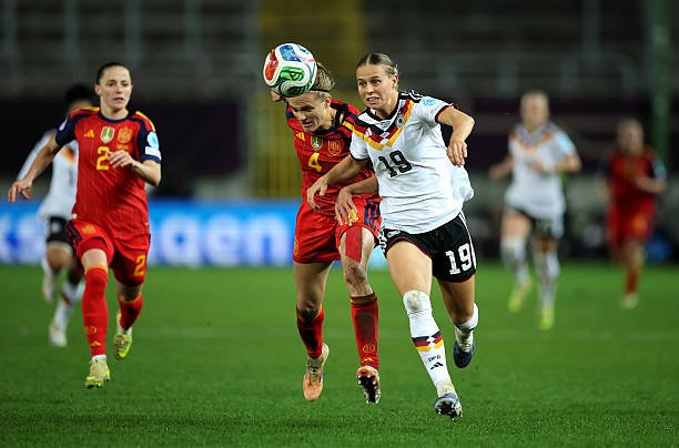 The game began with Germany on the front foot. Just two minutes in, Klara Bühl forced Cata Coll into a smart save after a clever pass from Elisa Senss. Spain soon started to find their rhythm, creating a chance from a corner when Laia Aleixandri’s close-range header was blocked. Aleixandri picked up a yellow card shortly after for a foul on Jule Brand. Germany had the better of the half, piling on the pressure and winning a string of corners. They created several half-chances. Janina Minge had two shots blocked, Rebecca Knaak’s header was saved, and Franziska Kett and Bühl both forced good stops from Coll, but they couldn’t find a way through. Spain’s clearest opening came when Aitana Bonmatí tried her luck from distance, only to see Ann-Katrin Berger hold the shot comfortably. Both defenses stood firm, and neither side could find a breakthrough. The half ended goalless, with Spain having a late corner that came to nothing
